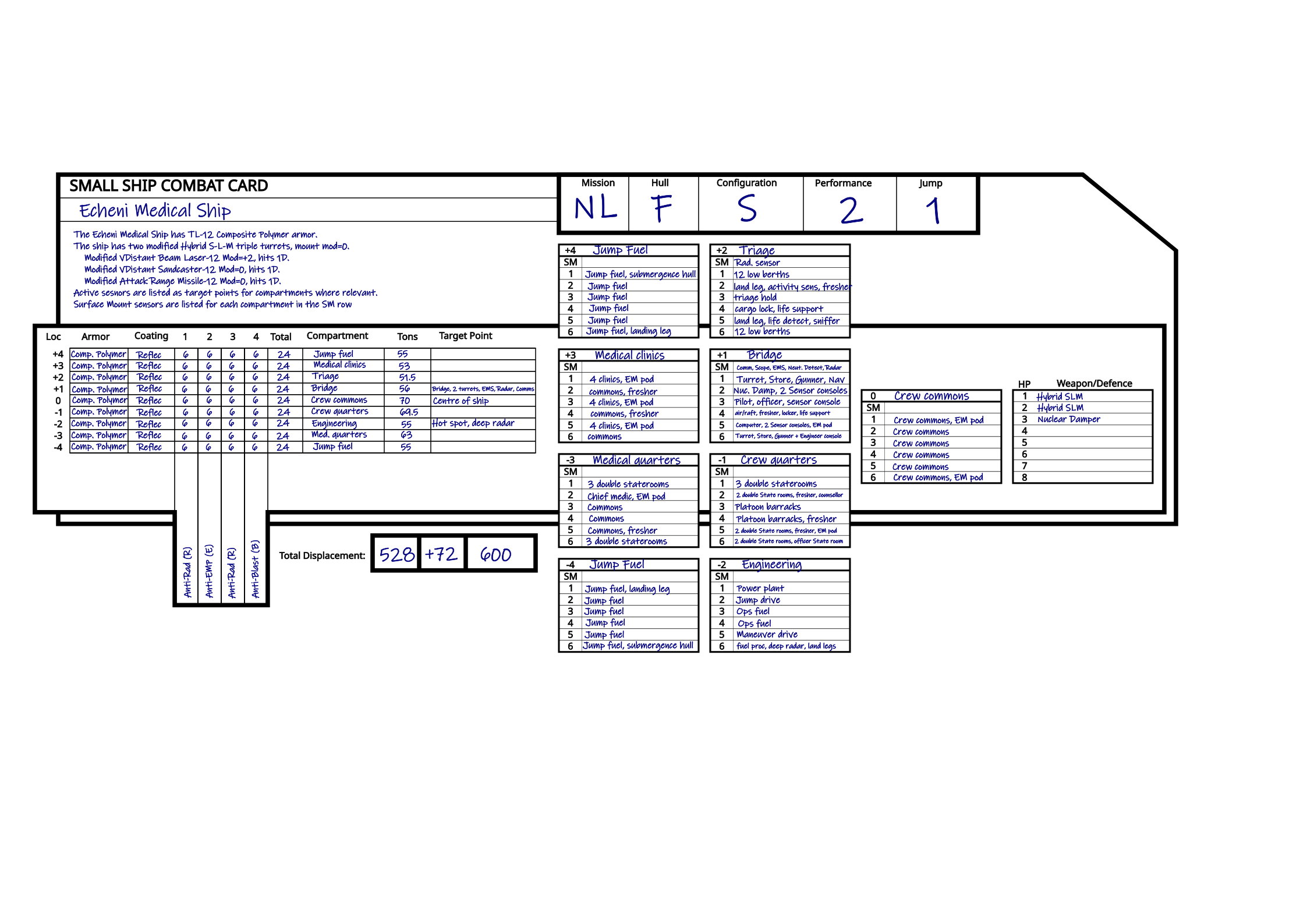 The ship is capable of Jump-1 and 2G maneuver. The ship has the endurance